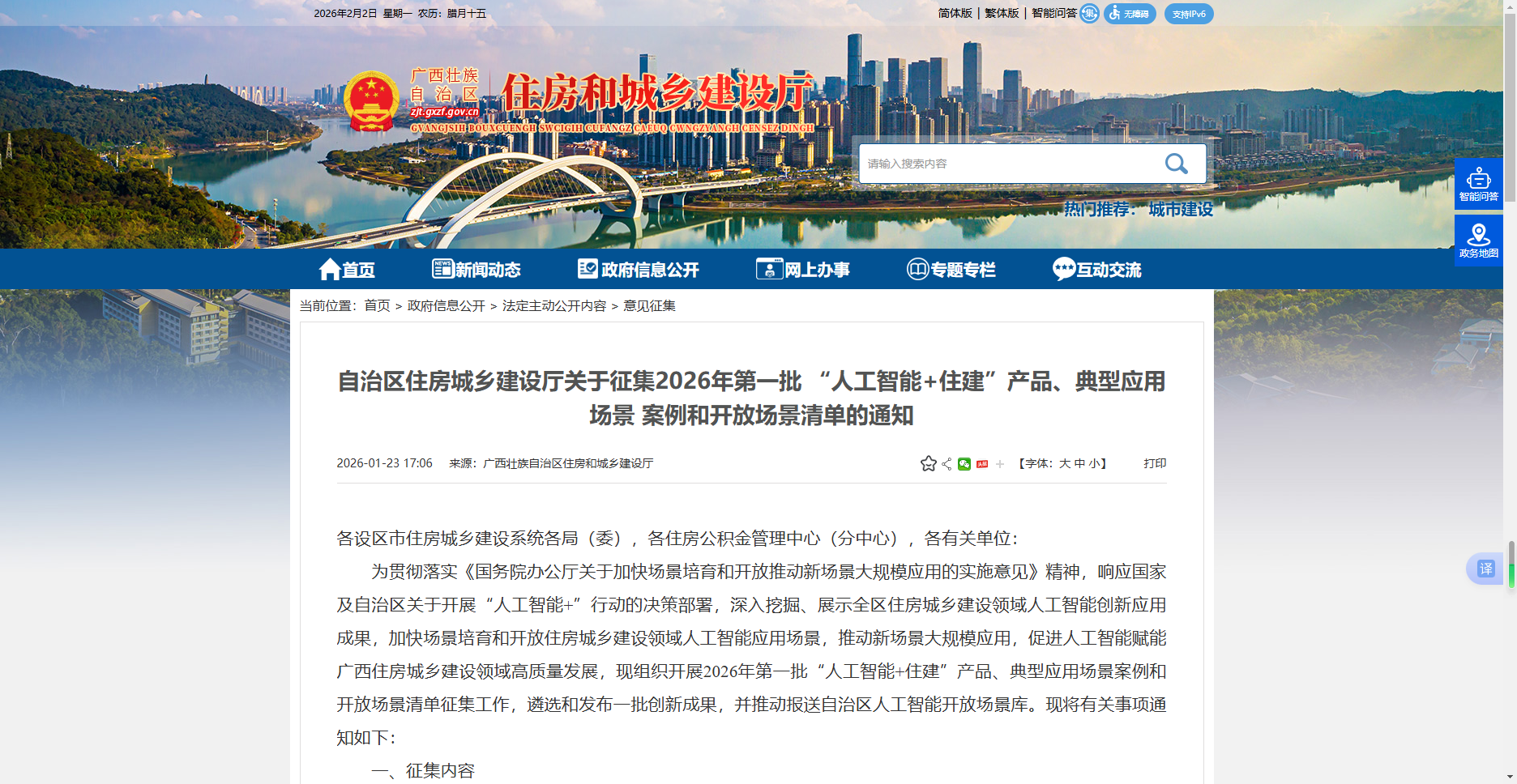为贯彻落实《国务院办公厅关于加快场景培育和开放推动新场景大规模应用的实施意见》精神,响应国家及自治区关于开展“人工智能+”行动的决策部署,深入挖掘、展示全区住房城乡建设领域人工智能创新应用成果,加快场景培育和开放住房城乡建设领域人工智能应用场景,推动新场景大规模应用,促进人工智能赋能广西住房城乡建设领域高质量发展,现组织开展2026年第一批“人工智能+住建”产品、典型应用场景案例和开放场景清单征集工作,遴选和发布一批创新成果,并推动报送自治区人工智能开放场景库。现将有关事项通知如下: