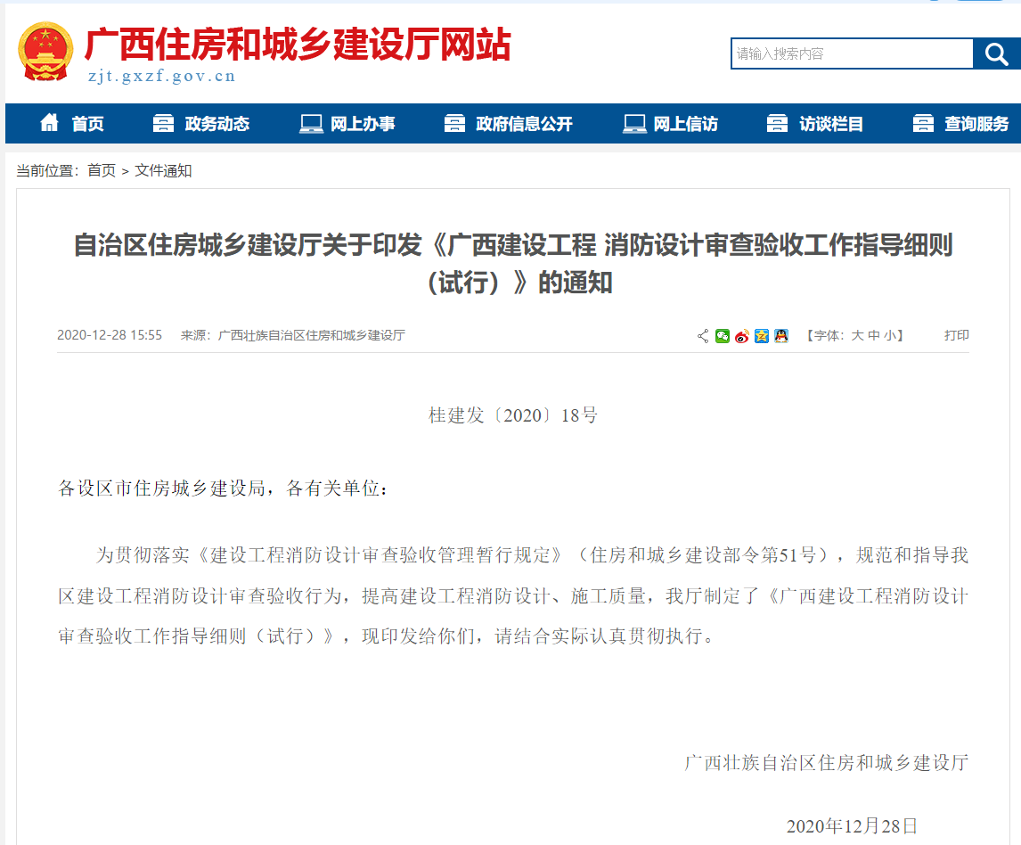 自治区住房城乡建设厅关于印发《广西建设工程 消防设计审查验收工作指导细则 (试行)》的通知