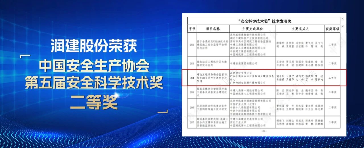 近日,中国安全生产协会正式公布了第五届安全科学技术奖获奖名单,由润建股份有限公司牵头,联合广西壮族自治区住房和城乡建设信息中心、广州市泺立能源科技有限公司共同实施完成的《建设工程消防安全监管与智能融合监控技术研究与应用》项目,凭借其在建设工程消防安全领域的创新技术与应用,荣获安全科学技术奖二等奖。