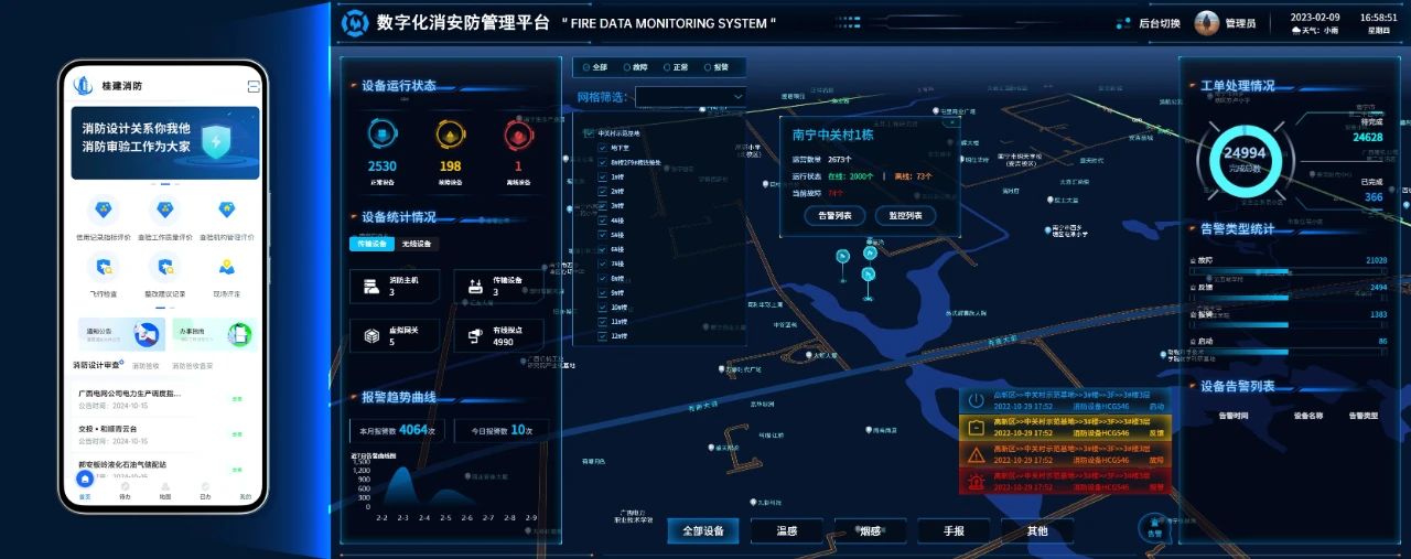 数字化消防管理平台:运用“物联网+消防联动+视频监控+电气安全”技术,实时监控消防报警数据、视频监控画面和电气安全数据,通过手机或PC端等平台进行故障预警、消息推送、运维及安全评估,有效监控电气火灾隐患,及时发现消防设备告警,降低企业投入成本,提升安全运行效率。