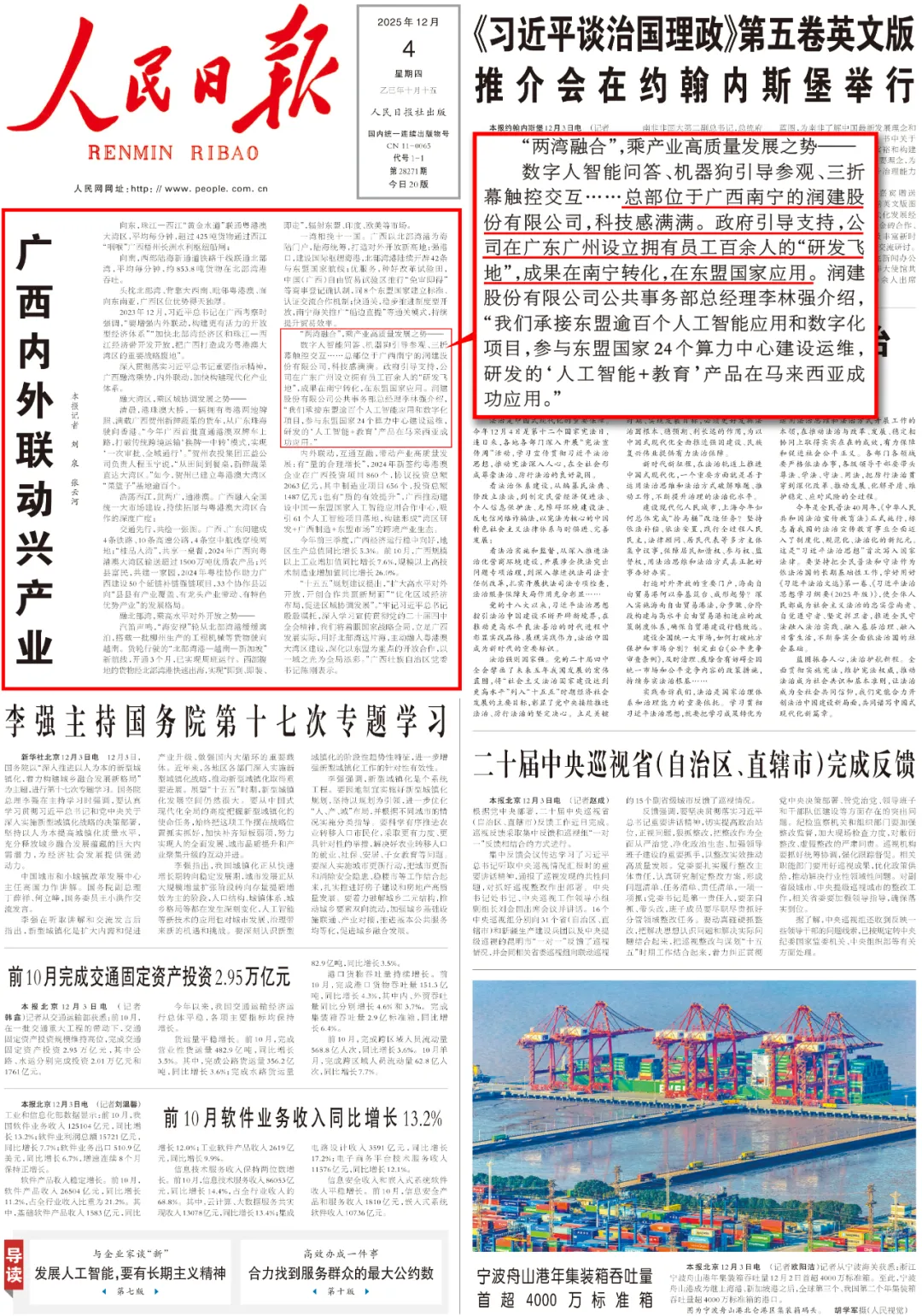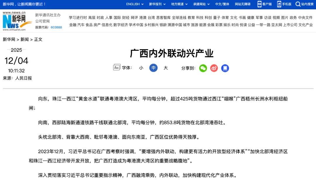 12月4日,见证润建股份迎来高光时刻——润建股份荣登《人民日报》头版头条!这篇题为《广西内外联动兴产业》的文章同时获得人民网、新华网等多家权威媒体转载报道,生动呈现公司人工智能技术及产业实践成果,润建股份作为人工智能领域领军企业,成为区域产业升级与科技创新的鲜明标志。