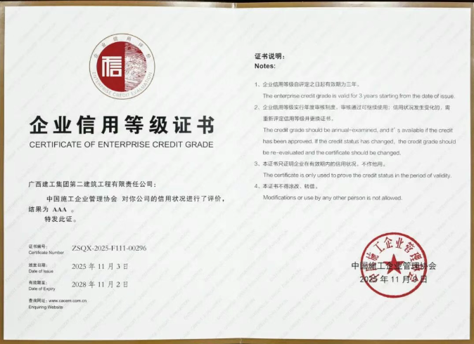 工程建设企业信用评价是国家推进行业信用体系建设的重要举措,涵盖企业管理、经营、财务、社会责任等多维度内容,其中AAA级为最高等级,已成为企业市场准入、投标资格审查、行业评优等重要依据。广西建工集团第二建筑工程有限责任公司2013年首次获评工程建设企业信用评价AAA级,至今已连续12年保持AAA级信用评级,体现了行业对广西建工集团第二建筑工程有限责任公司诚信履约、工程质量和规范管理等工作的高度认可。
