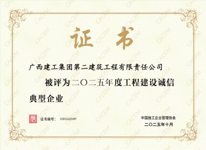 此次荣获工程建设企业信用评价AAA级认定和工程建设诚信典型企业称号,不仅是对广西建工集团第二建筑工程有限责任公司长期以来坚持诚信经营的充分肯定,更是对企业管理水平、履约能力和社会责任践行的全面检验。面向“十五五”发展新征程,广西建工集团第二建筑工程有限责任公司将持续深化信用体系建设,进一步强化信用管理赋能,巩固AAA级信用成果,发挥诚信典型示范作用,助力行业高质量发展,在新时代工程建设领域不断树立新形象、展现新作为。
