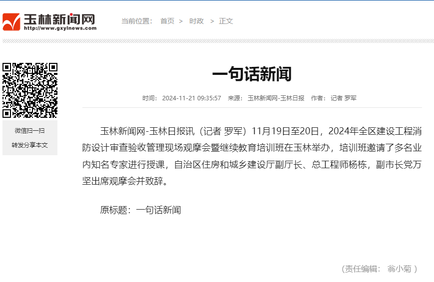 2024年11月19日至20日,2024年全区建设工程消防设计审查验收管理现场观摩会暨继续教育培训班在玉林举办,培训班邀请了多名业内知名专家进行授课,自治区住房和城乡建设厅副厅长、总工程师杨栋,副市长党万坚出席观摩会并致辞。