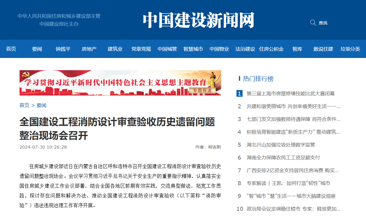 1. 中国建设新闻网2024年7月30日刊登《全国建设工程消防设计审查验收历史遗留问题整治现场会召开》文章会议对呼和浩特市整治工作举措和成效予以肯定,内蒙古自治区、河南省、甘肃省、呼和浩特市、包头市相关负责人介绍建设工程消防审验历史遗留问题整治工作典型经验做法。