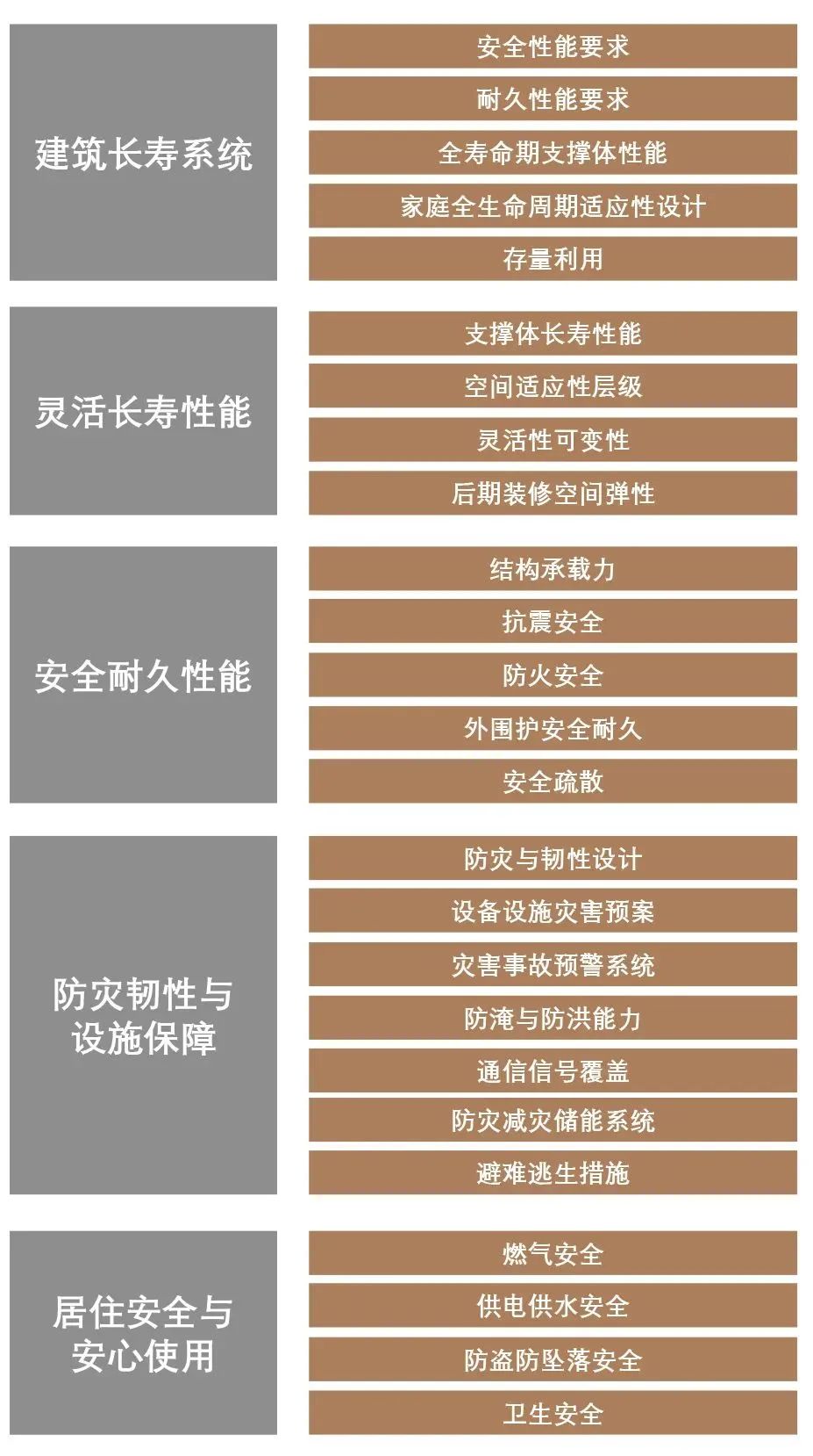 建筑长寿化:从安全性能、耐久性能、全寿命期支撑体性能等维度出发,提出了灵活长寿性能、安全耐久性能、防灾韧性与设施保障等要求。这些要求旨在延长建筑的使用寿命,降低维护成本,提升住房的资产价值。