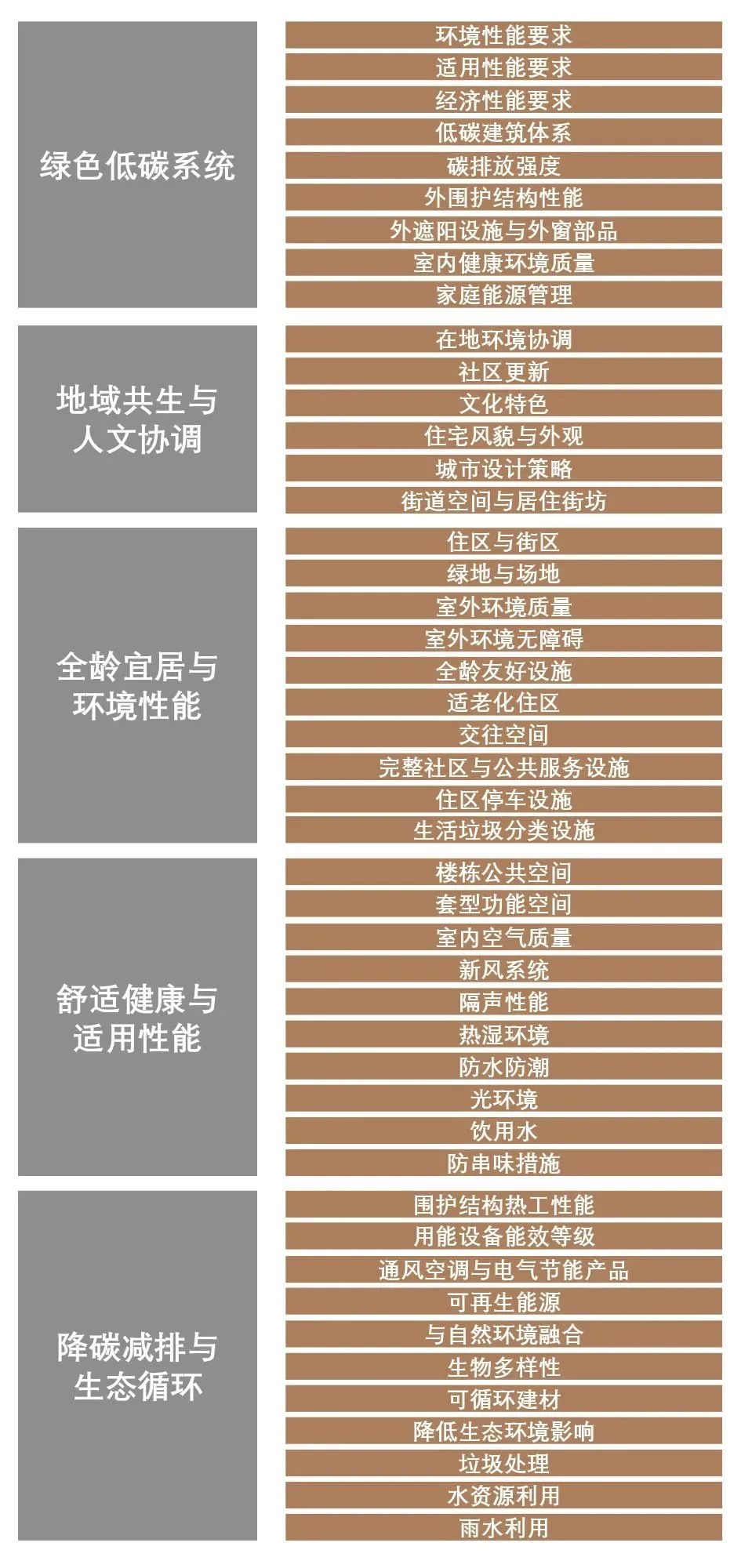 绿色低碳化:从环境性能、适用性能、经济性能等方面入手,提出了地域共生与人文协调、全龄宜居与环境性能、舒适健康与适用性能、降碳减排与生态循环等要求。这些要求旨在实现住房建设与自然环境的和谐共生,降低能源消耗,减少碳排放。