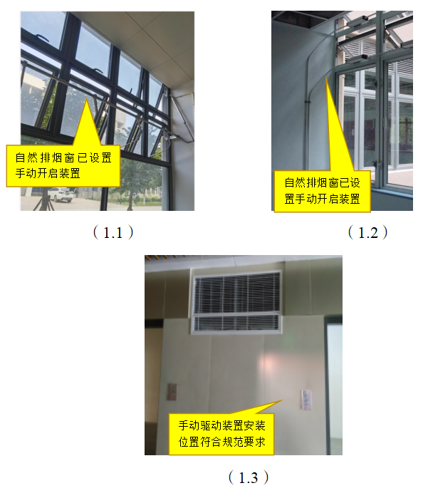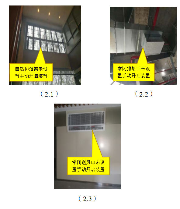 2)错误做法:图2.1-2.3中,在高位不便于直接开启的自然排烟窗未在距地面高度1.3m~1.5m设手动开启装置;顶部常闭排烟口未在距楼地面1.3m~1.5m设手动驱动装置,不满足规范要求。