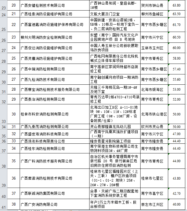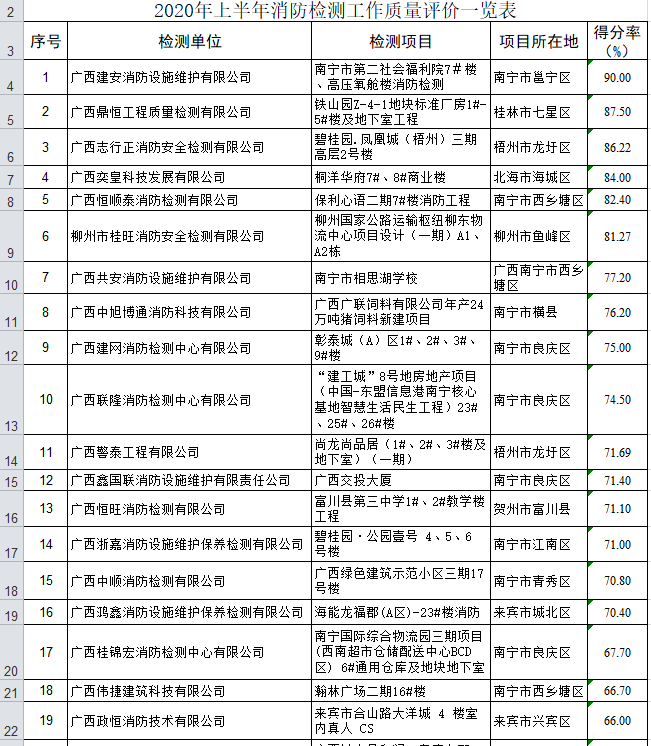 为规范我区建设工程消防检测工作,加强对建设工程消防检测技术服务机构(以下简称“检测机构”)的管理,构建行业诚信体系,提升消防技术服务质量,根据《自治区住房城乡建设厅关于开展2020年上半年建设工程消防检测技术服务机构诚信综合考核评价工作的通知》(桂建消〔2020〕3号)安排,我厅于 2020年5月26日至6月13日对在广西建设工程消防设计审查验收备案管理平台完成信息核对并已出具检测报告的检测机构开展了诚信综合考核评价。现将综合考核评价结果公布报如下:
