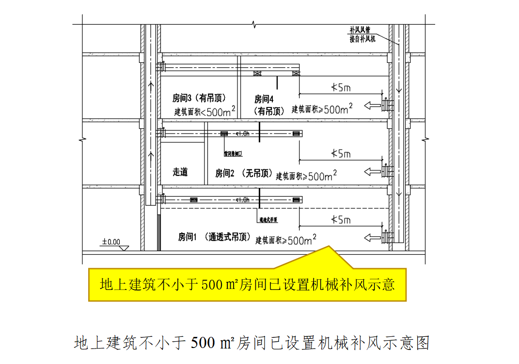 1)正确做法:设置排烟系统的地上建筑面积不小于500㎡的房间设置补风系统。补风系统可采用疏散外门、手动或自动可开启外窗等自然进风方式以及机械送风方式,见下图。