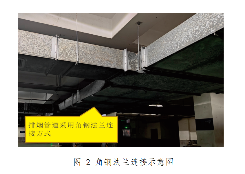 2)正确做法:设计图纸应明确防排烟管道的连接方式,施工单位应严格按照设计图纸施工。当采用薄钢板法兰(共板法兰)时,应采用螺栓连接,且薄钢板法兰高度、螺栓规格及螺栓孔间距等,应按照《建筑防烟排烟系统技术标准》GB51251-2017表6.3.1的规定执行。根据防排烟风管规格大小,施工单位按照设计要求采购和使用相应厚度的镀锌钢板。采用角钢法兰连接见图 2。