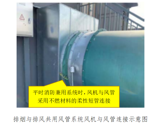 排烟与排风共用风管系统时应加设柔性短管,该柔性短管应采用不燃材料,见下图。