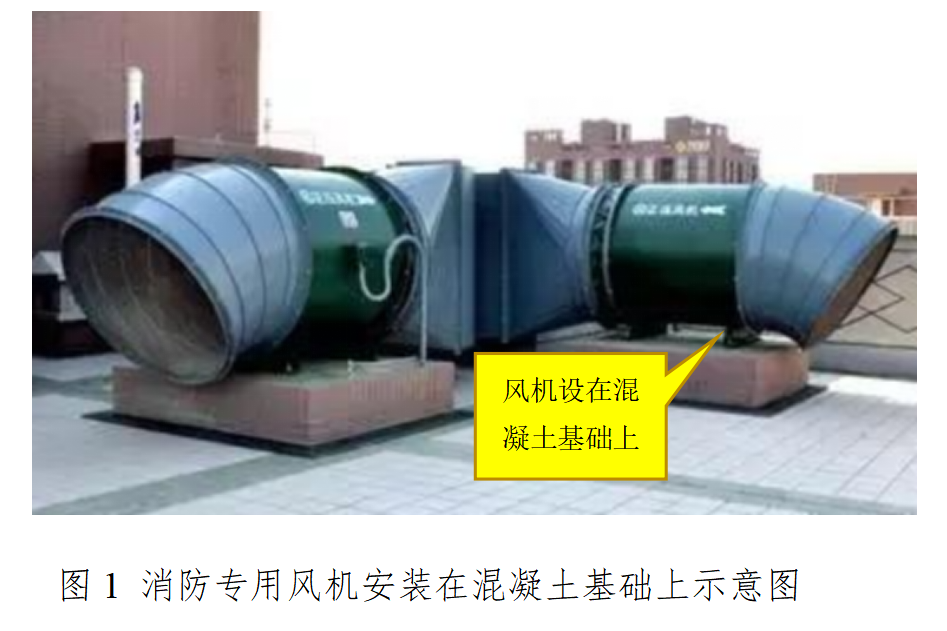 1)正确做法:消防专用风机设在混凝土或钢架基础上,且不应设置减振装置,见图1。