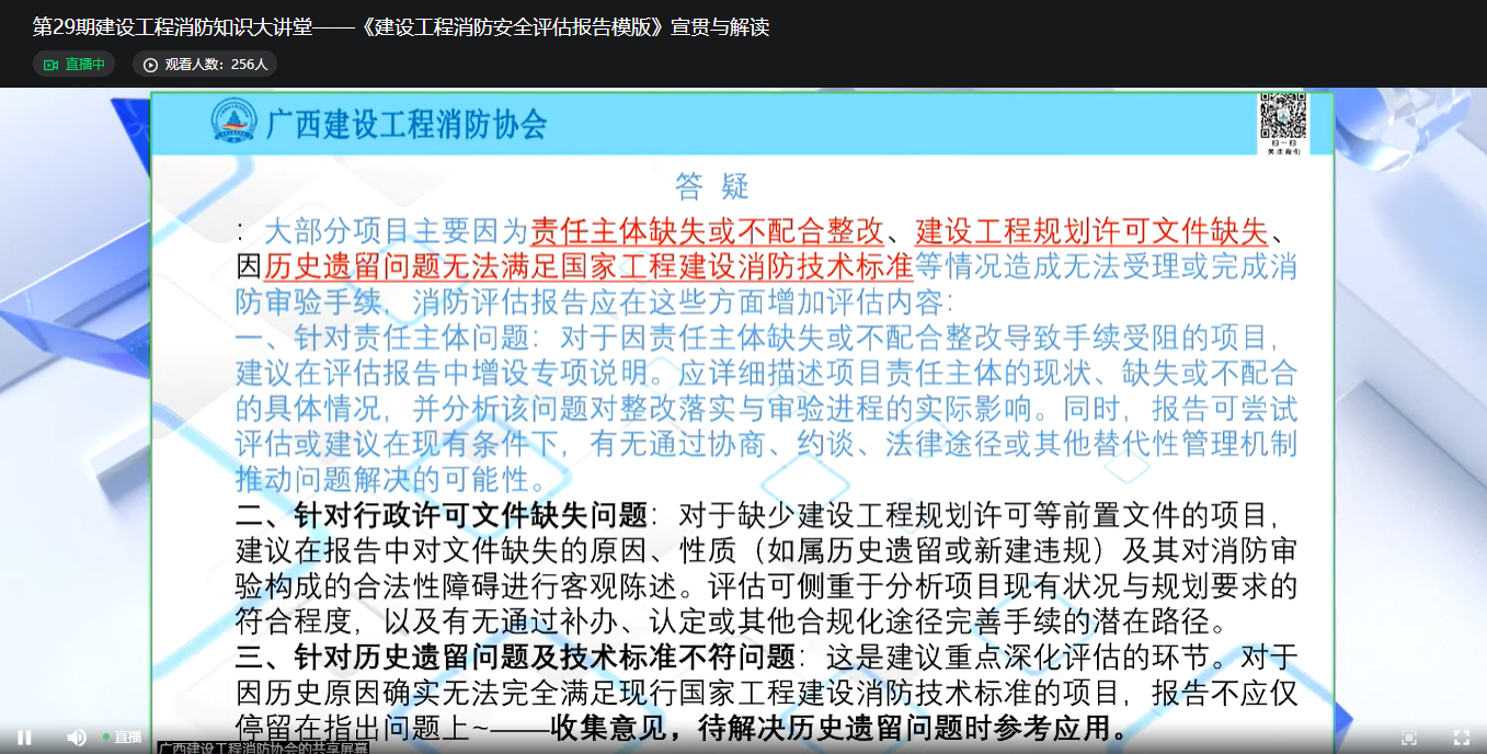 直播吸引了来自全区各级住房城乡建设主管部门、消防技术服务机构、消防安全评估单位及相关企业共256家单位集中在线观看,近千名从业人员同步参与学习。参训人员普遍表示,课程内容系统全面、讲解清晰透彻,对今后规范开展广西建设工程消防安全评估工作具有重要指导意义。