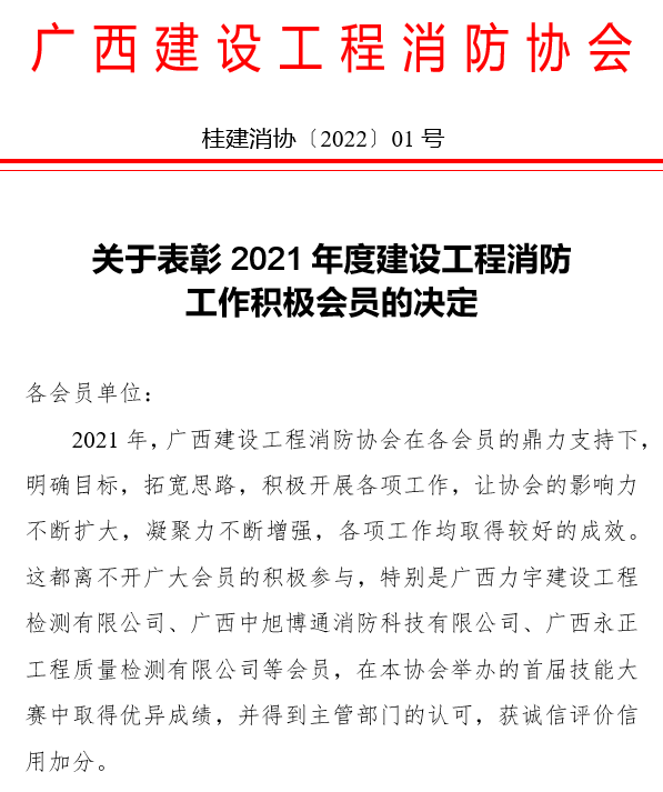 为树立榜样,表彰先进,现决定对在2021年全国首届建筑防火创新发展大会、广西建设工程消防协会首届技能大赛、2021广西建设工程消防验收查验现场观摩会等工作中积极参与的广西固荣消防技术事务所有限公司等20家会员予以表彰。希望受表彰的会员珍惜荣誉,再接再厉,在新的一年里再创佳绩!也希望各会员积极参与行业协会活动,为推动广西建设工程消防行业高质量发展贡献力量!
