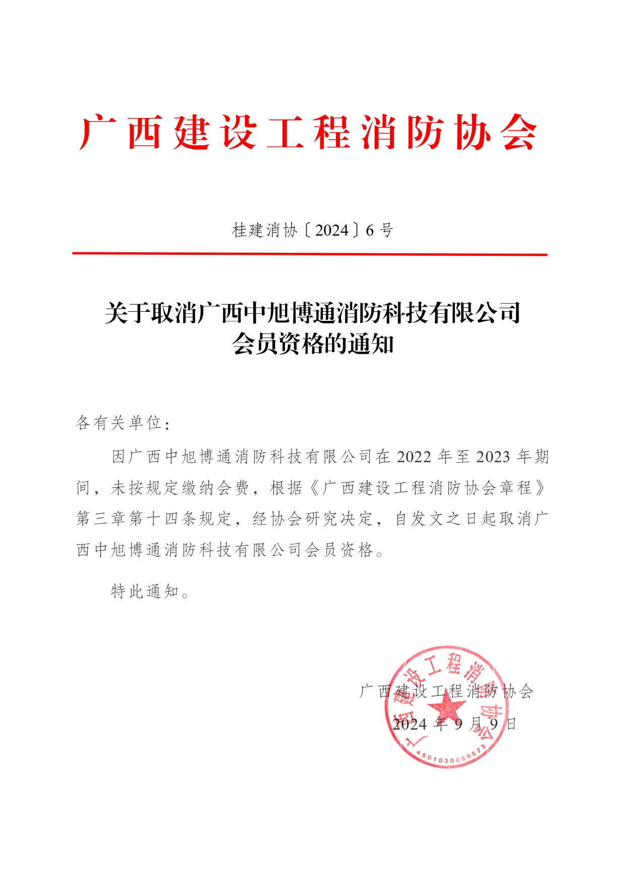 关于取消广西中旭博通消防科技有限公司会员资格的通知